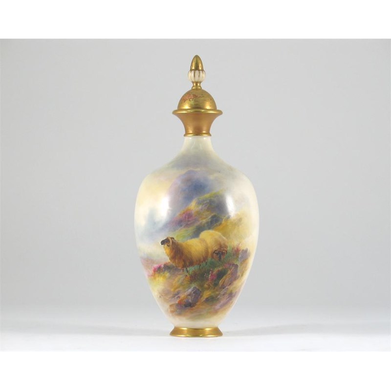 A Royal Worcester ovoid vase and cover, painted with two rams on a mountain, signed 'H. Davis', green printed mark. Some wear to the gilding to the cover. c.1910, 25cm. (2)