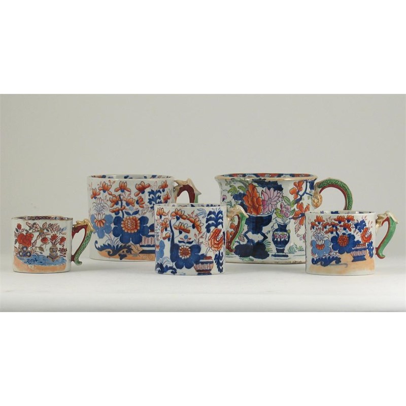 Five Mason's Ironstone mugs, variously decorated with stylized flowers and foliage, all with factory marks, 23cm. Max. (5)