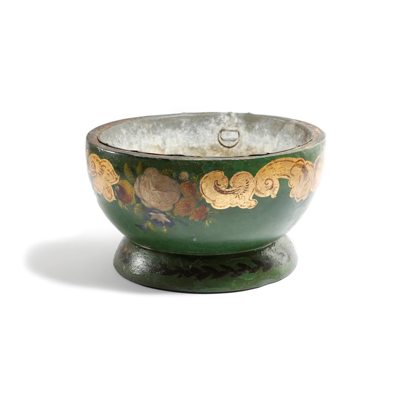 A GREEN TOLE PEINTE PLANTER 19TH CENTURY painted with roses and with parcel gilt and ebonised...