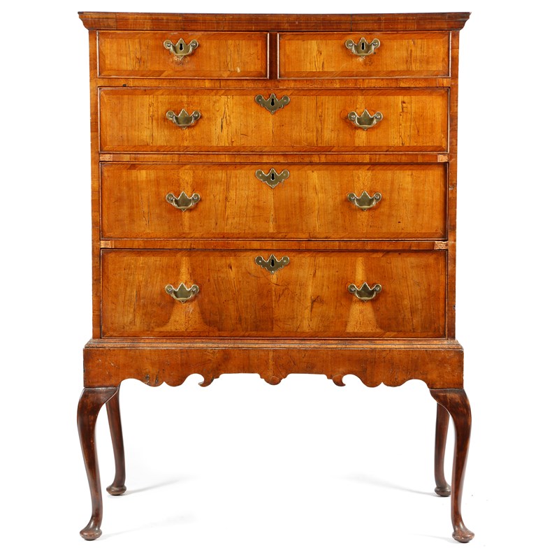 the crossbanded top above two short and three long conforming graduated drawers, the stand with a shaped frieze on later beechwood cabriole legs