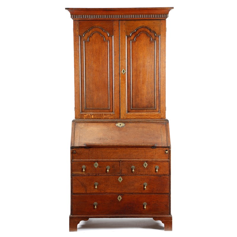 the chevron moulded frieze above a pair of arched panelled doors enclosing adjustable shelves, the hinged fall with a rest, revealing an interior fitted with drawers, pigeonholes and a central cupboard flanked by secret pilaster compartments, above a sliding well cover, with two short and two long drawers, on bracket feet