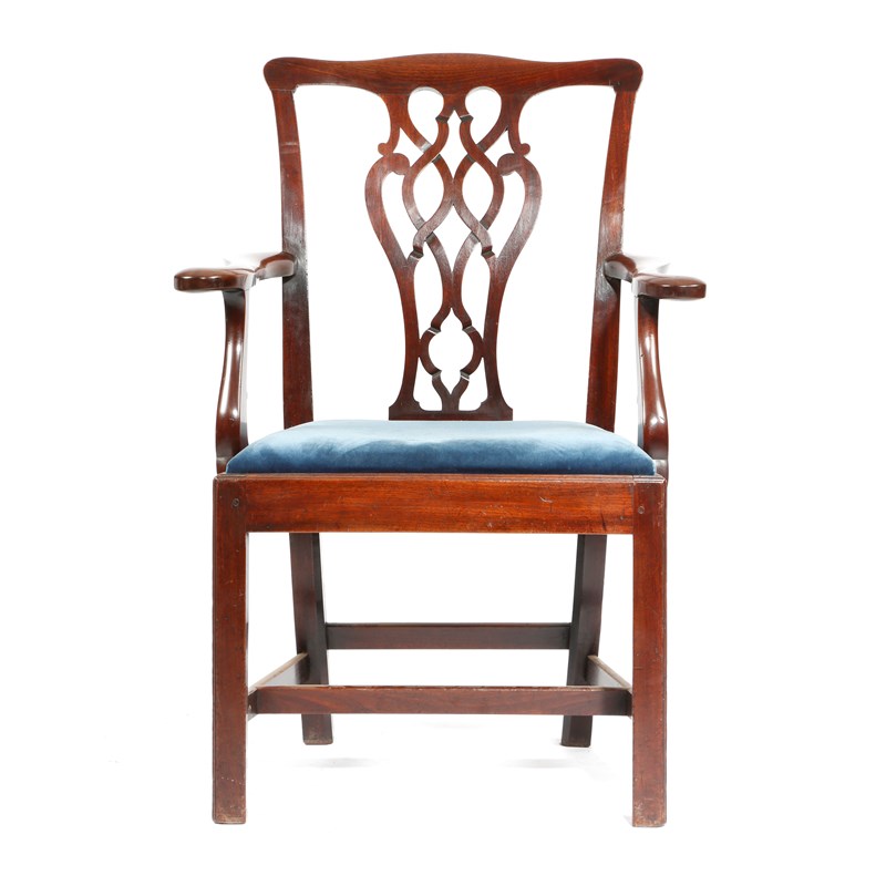 A GEORGE III MAHOGANY OPEN ARMCHAIR C.1770 with an interlaced and pierced splat back with...