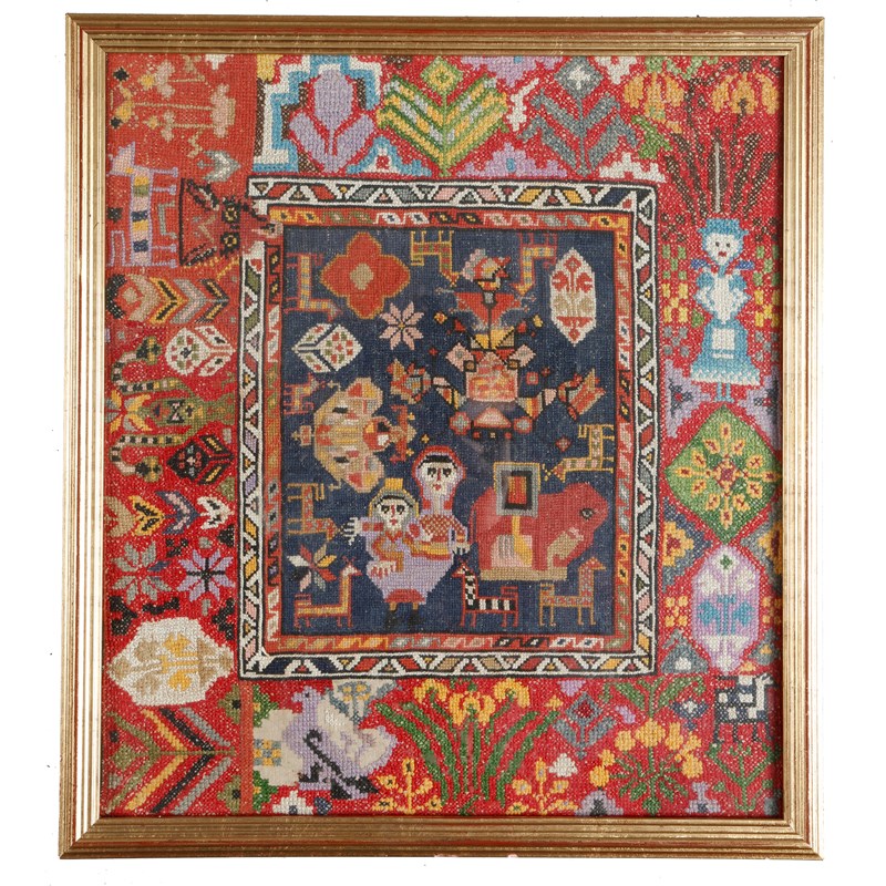 worked on a linen foundation with various different tribal and village design motifs, Caucasian, Azerbaijan, Swedish and Greek, including: an elephant, a donkey's head, figures, birds, flowers and leaves in a later gilt glazed frame