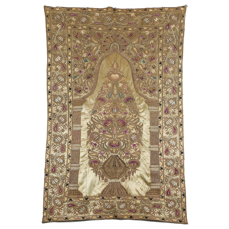 embroidered in metal thread and silks with a flower filled urn beneath an arch with a pendant mosque lamp