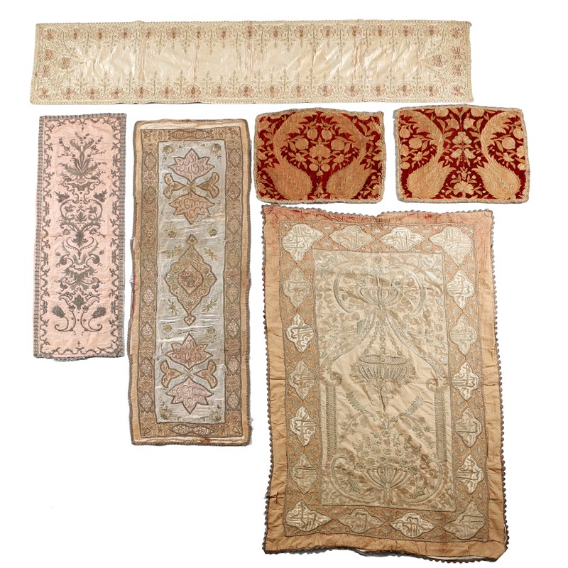 an Indian runner, an Italian pink cushion cover, together with two Ottoman style cushion covers (6)