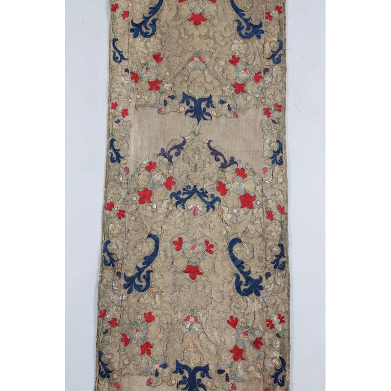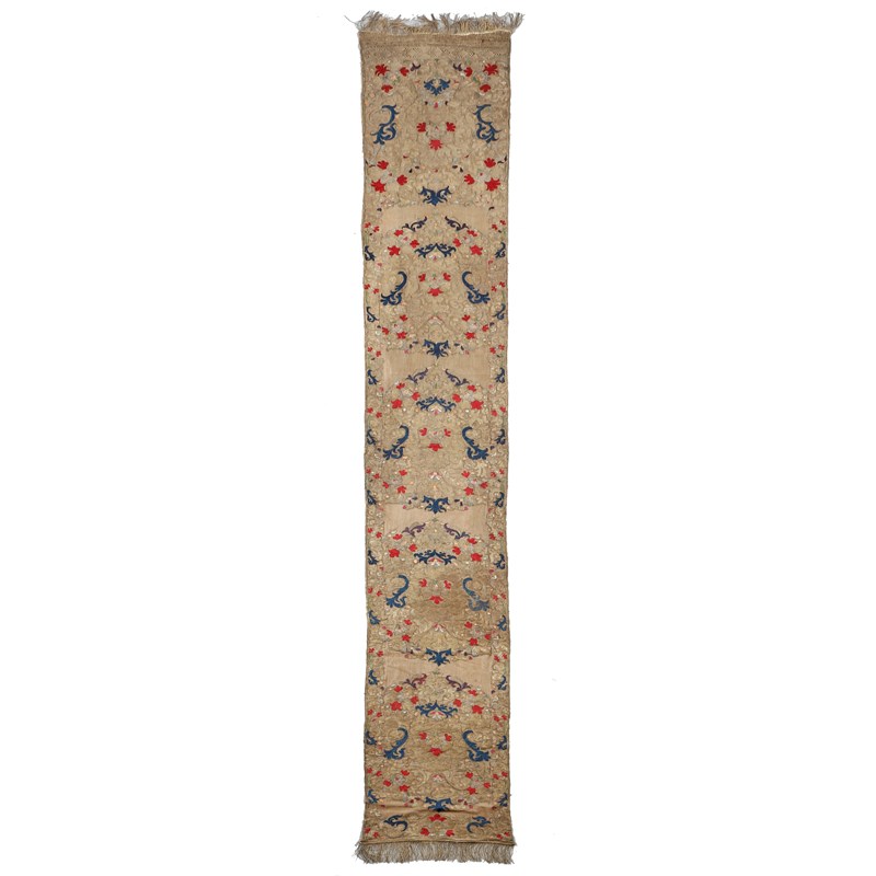 the plain muslin ground embroidered with ogival medallions and flourishes in silks and metal thread, with a gilt fringed edge