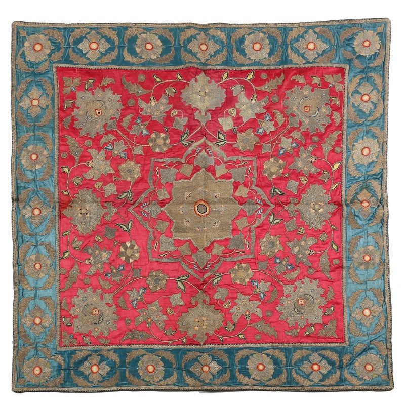 embroidered in silk and silver metal thread with a central stellar medallion among flowers