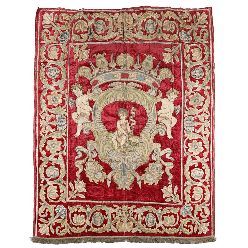 applique with a border of scrolling flowers, the centre with two putti holding up a crown, with the Christ child beneath with a lamb