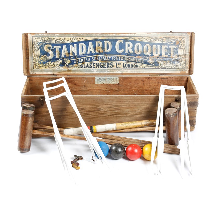 comprising: four lignum vitae mallets with hickory shafts, with painted cast iron hoops, balls, clips and a marker post, in a pine box with a printed maker's label, inscribed 'Standard croquet adapted specially for tournaments Slazengers Ltd London'