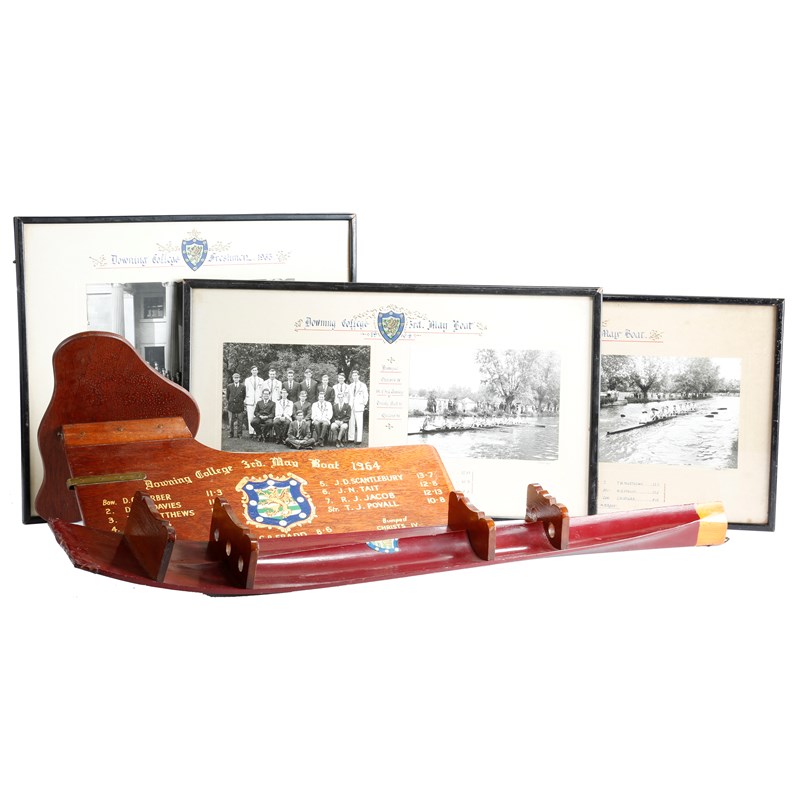 inscribed 'Downing College 3rd May boat 1964', centred with a coat of arms and the participants names, together with an oar converted into a wall hanging pipe rack, with three framed photographs from 1963, 1964 and 1966 (5)