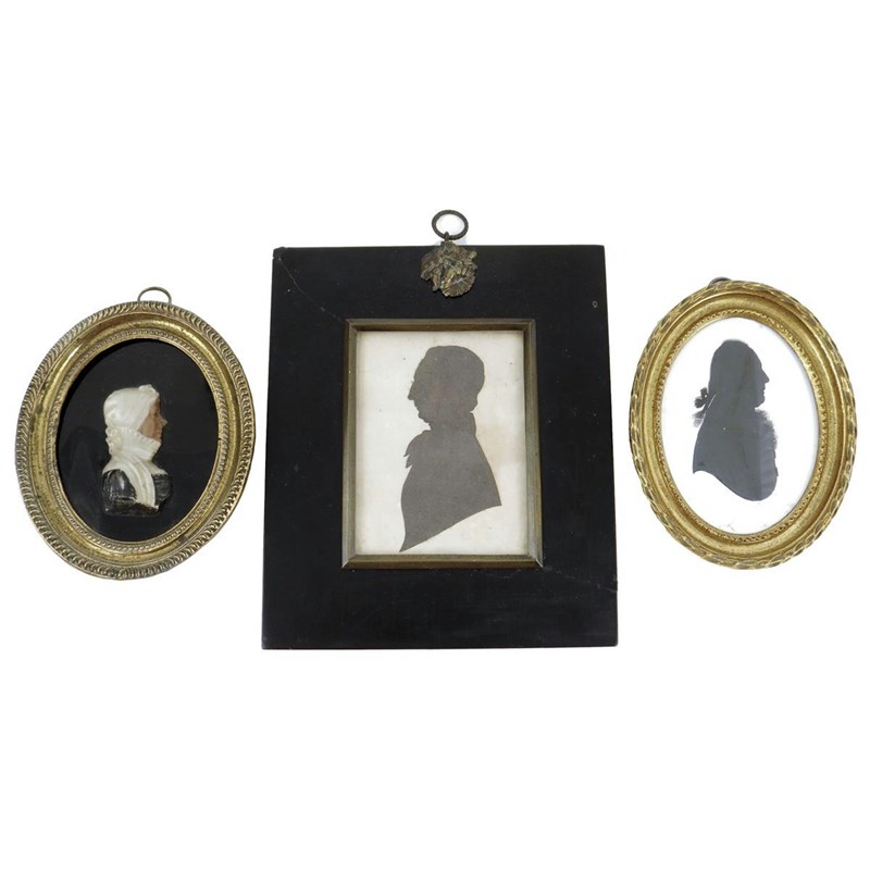 A George III silhouette of George Baillie Esq. by S Houghton, in a later frame, the back with remnants of the original paper label, 12.3 x 9.5cm, together with a silhouette portrait of a man in an ebonized frame and an 18th century wax bust of a lady. (3)