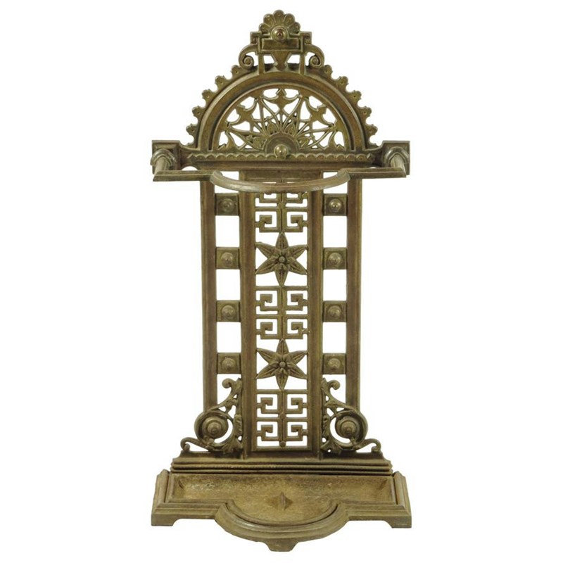A Victorian Falkirk cast iron stickstand, of arched form with pierced foliate and geometric decoration, the reverse stamped 'FALKIRK NO.33. PL. 256E', with a registration lozenge dated for 1st October 1873, the lift-out base also stamped, 74.8cm high, 38.9cm wide, 22cm deep.