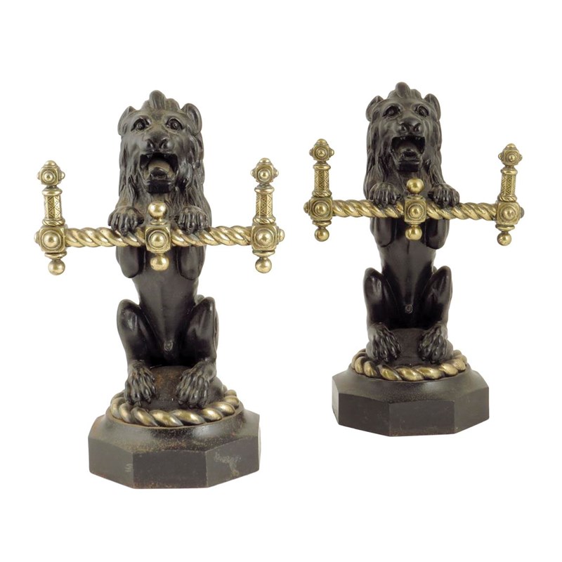 A pair of Victorian cast iron and gilt brass andirons, each in the form of a rampant lion, each holding a bar in its forepaws, 36cm high, 22.5cm wide. (2)