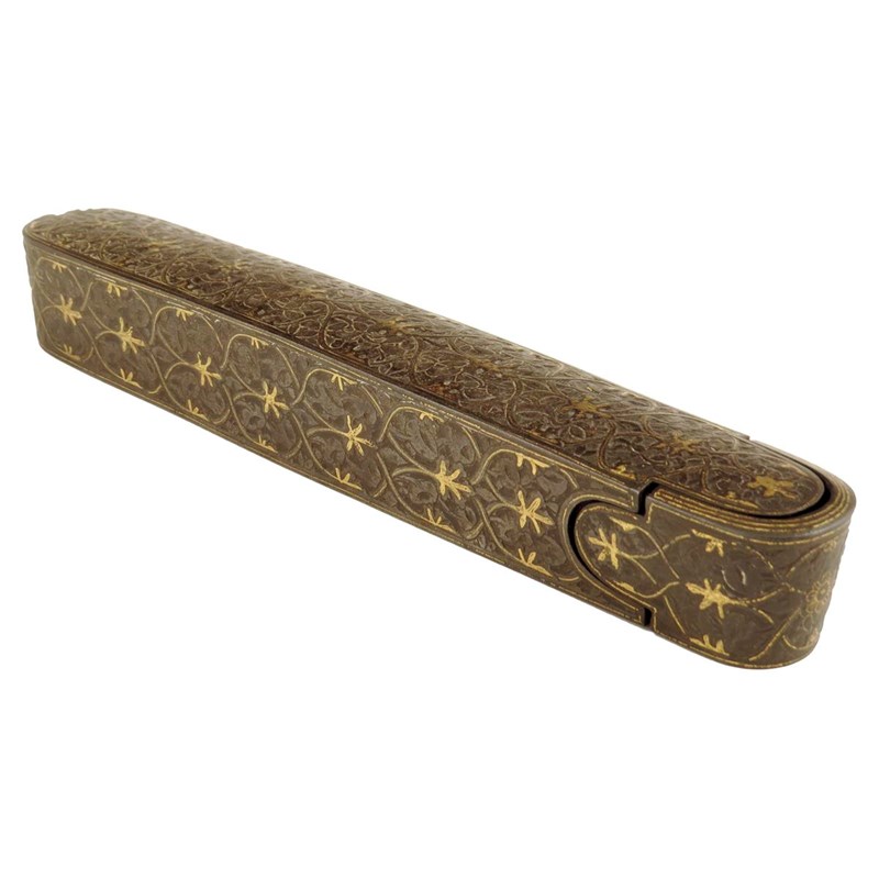 A Persian gilt damascened steel pen box qalamdan, decorated with scrolling foliage, 19th century possibly Qajar, 22.5cm long.