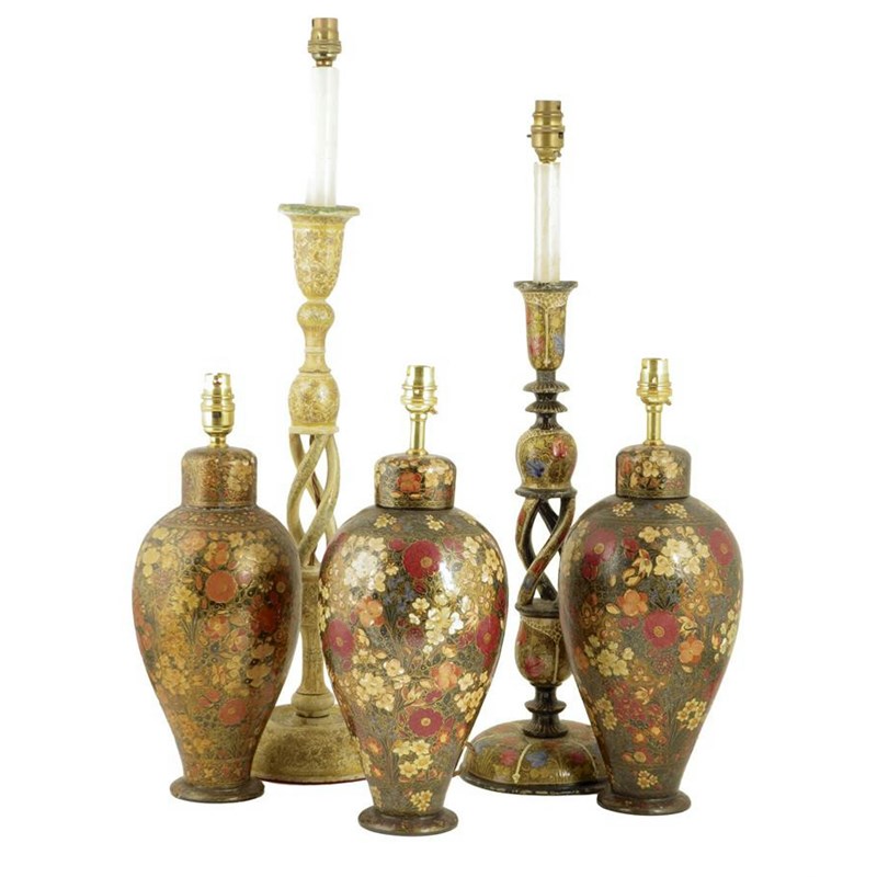 Five Kashmiri lacquer table lamps, three baluster shape, decorated with flowers and two with spiral twist stems, 69.8cm high, max. (5)