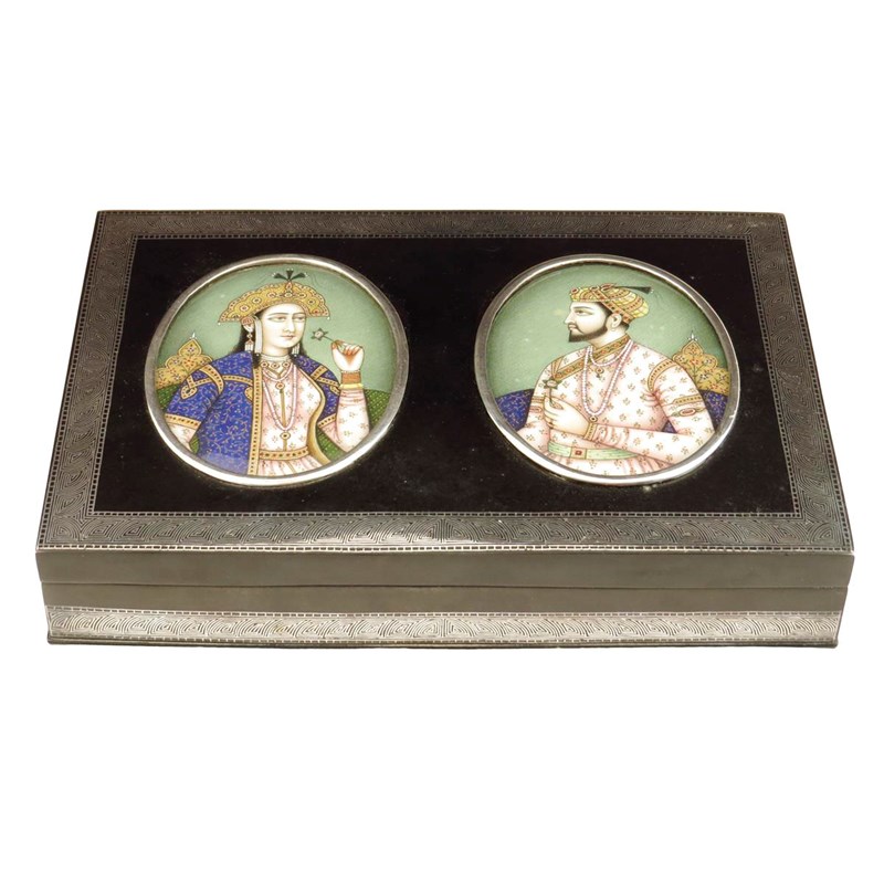 λAn Indian Bidri ware box, the hinged lid with two oval portrait miniatures of Shah Jahan and Mumtaz Mahal, 5.2cm high, 29.2cm wide, 19.8cm deep.