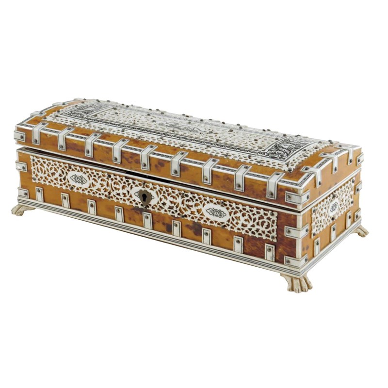 λAn Anglo-Indian tortoiseshell and ivory box, Vizagapatam, with pierced and lac decorated panels, one with a lion, the interior with a metal plaque inscribed 'TO SQUADRON LEADER T.E. PAVITT FROM THE PROFESSOR AND STUDENTS OF TELECOMMUNICATION ENGINEERING COLLEGE OF ENGINEERING GUINDY, MADRAS, WITH APPRECIATION AND GRATITUDE', the base inscribed with students' signatures, early 20th century, together with a typed letter from Professor Sreenivasan expressing his gratitude for the Squadron Leader Parvitt's help, 7.6cm high, 26.8cm wide, 12cm deep.