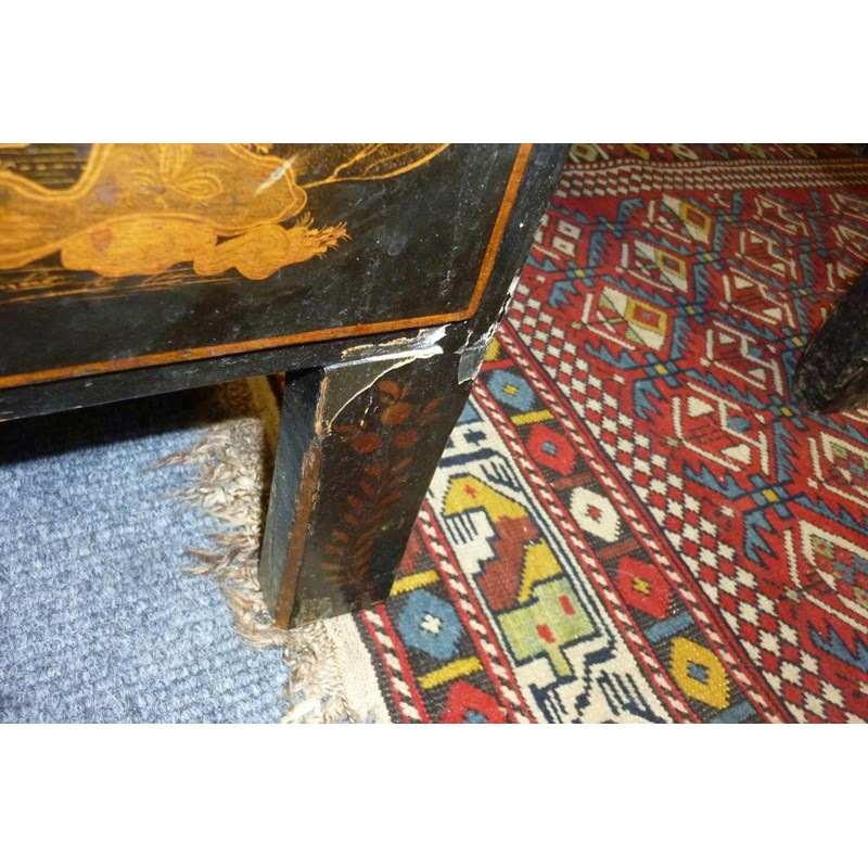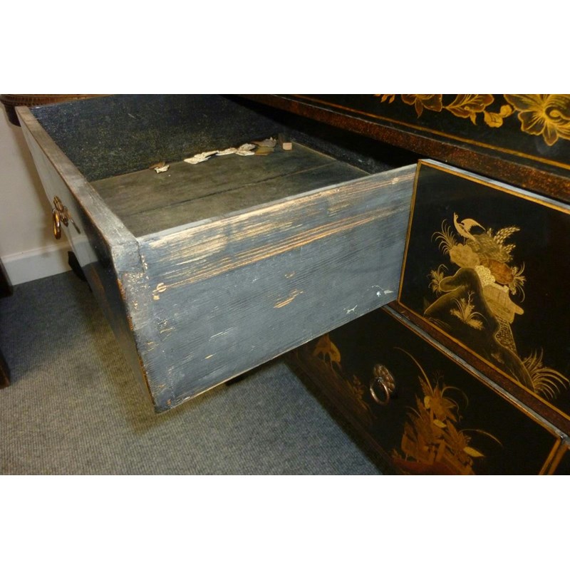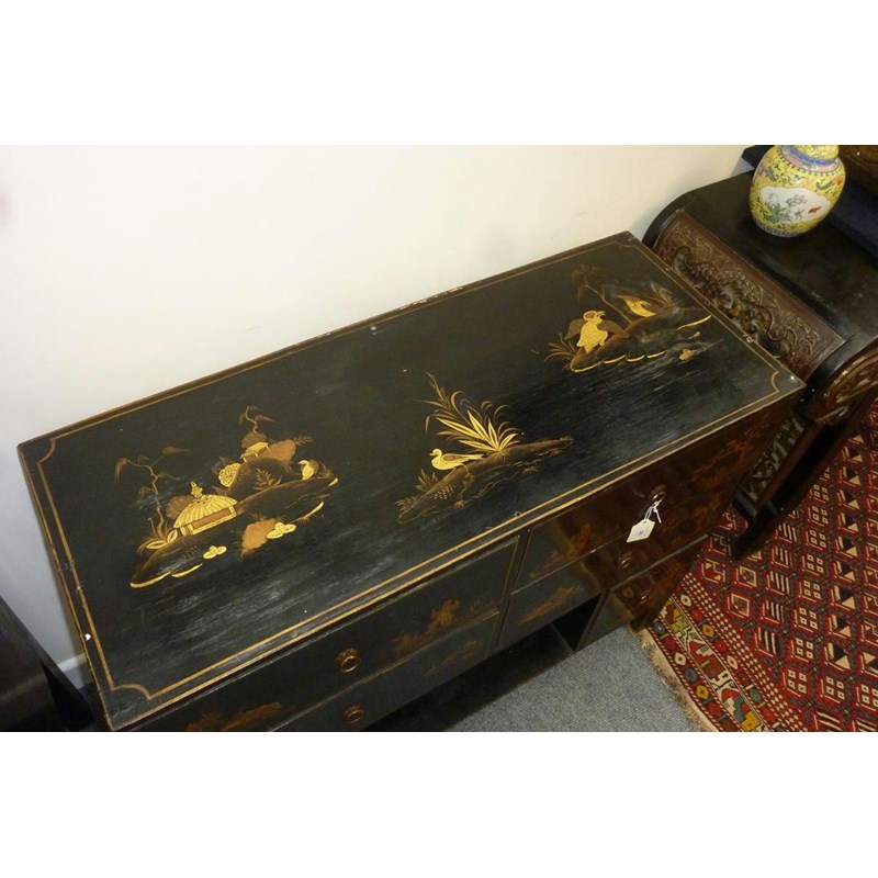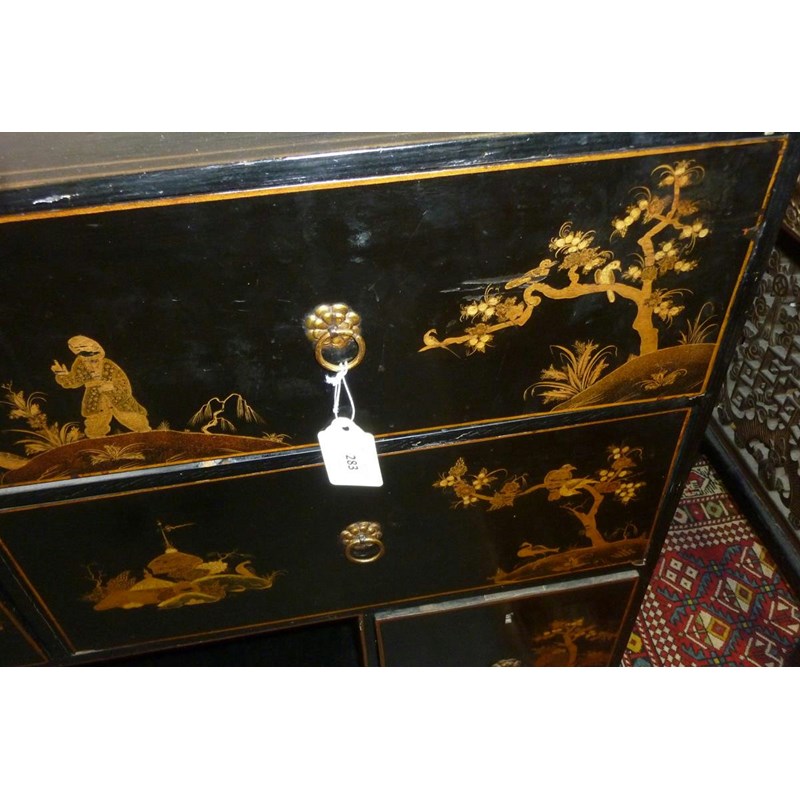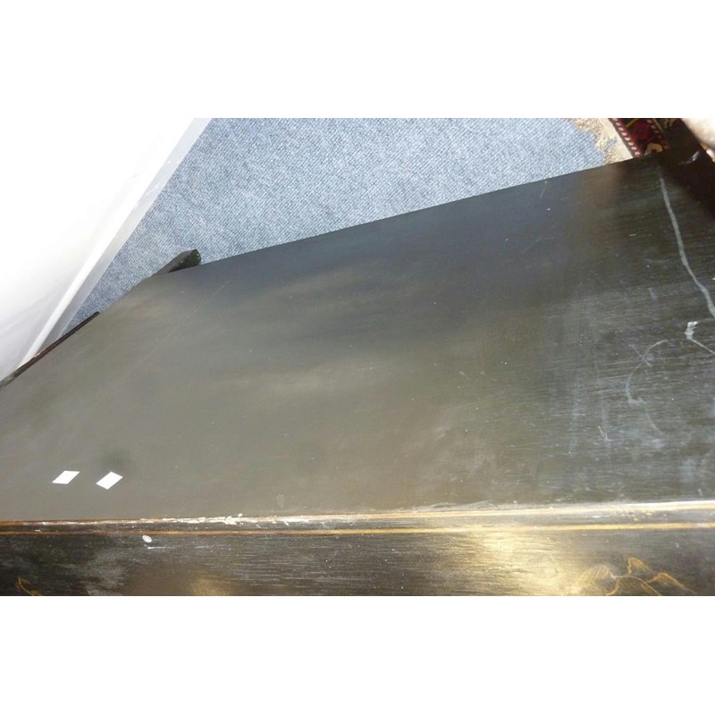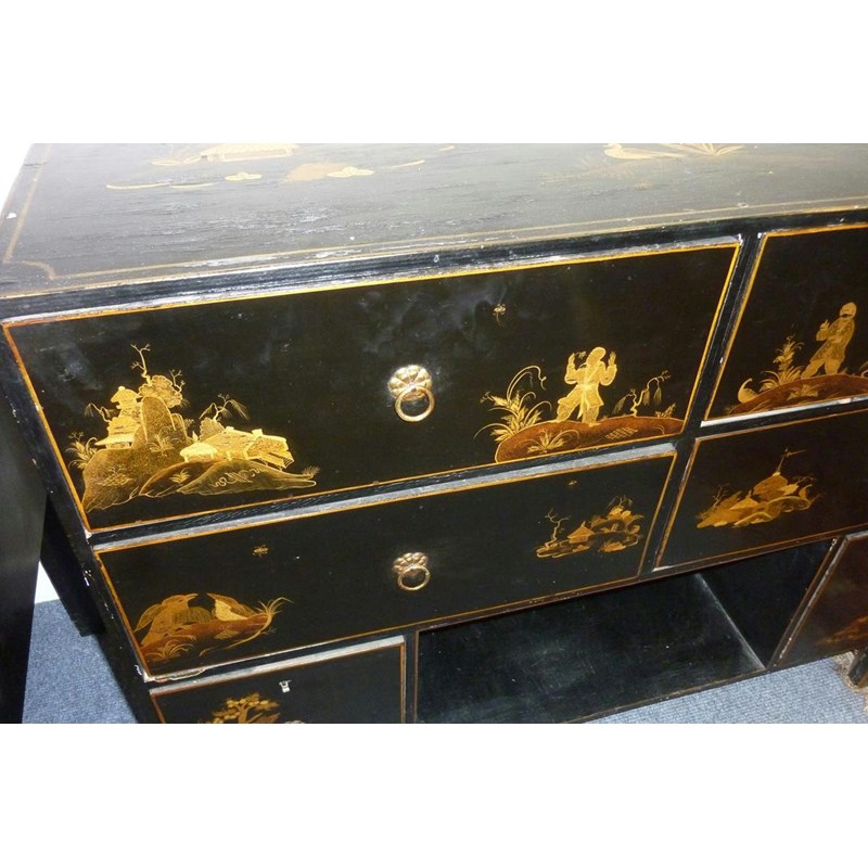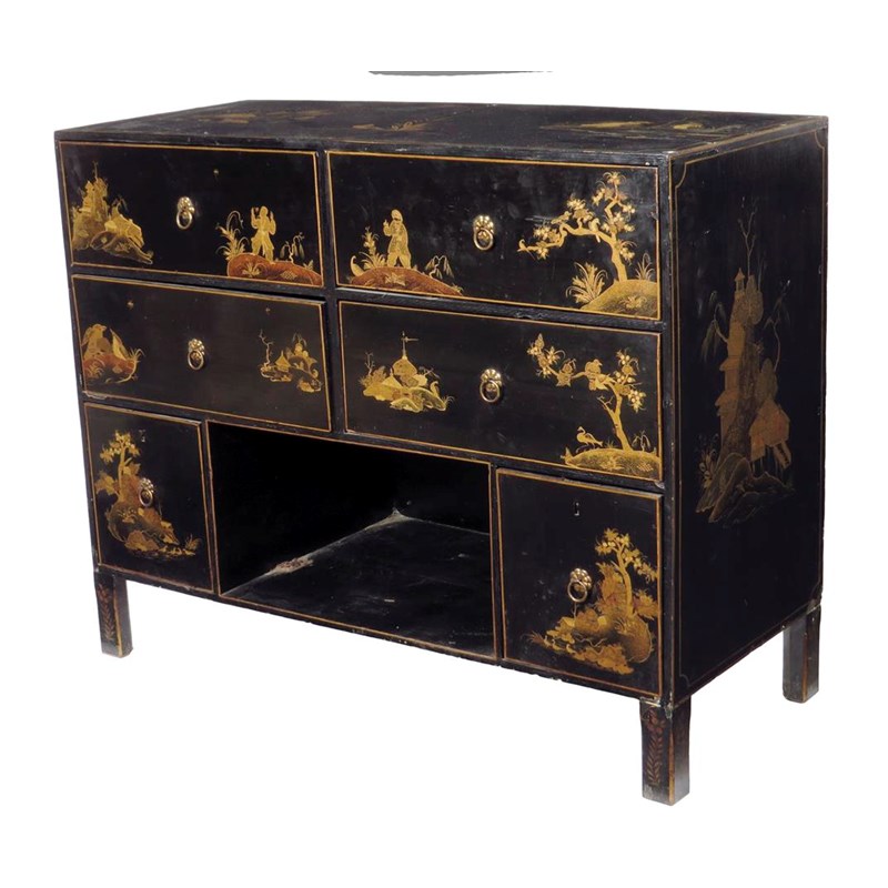 A Japanese black lacquer side cabinet, painted in gilt with figures in landscape scenes, with an arrangement of six drawers, 78.2cm high, 97.9cm wide, 40.5cm deep.