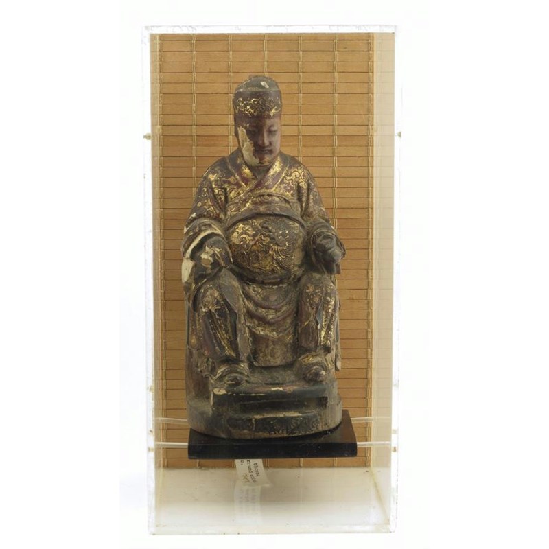 A 19th century Chinese carved giltwood and lacquered model of a seated Emperor, 22cm high, in a later perspex display case.