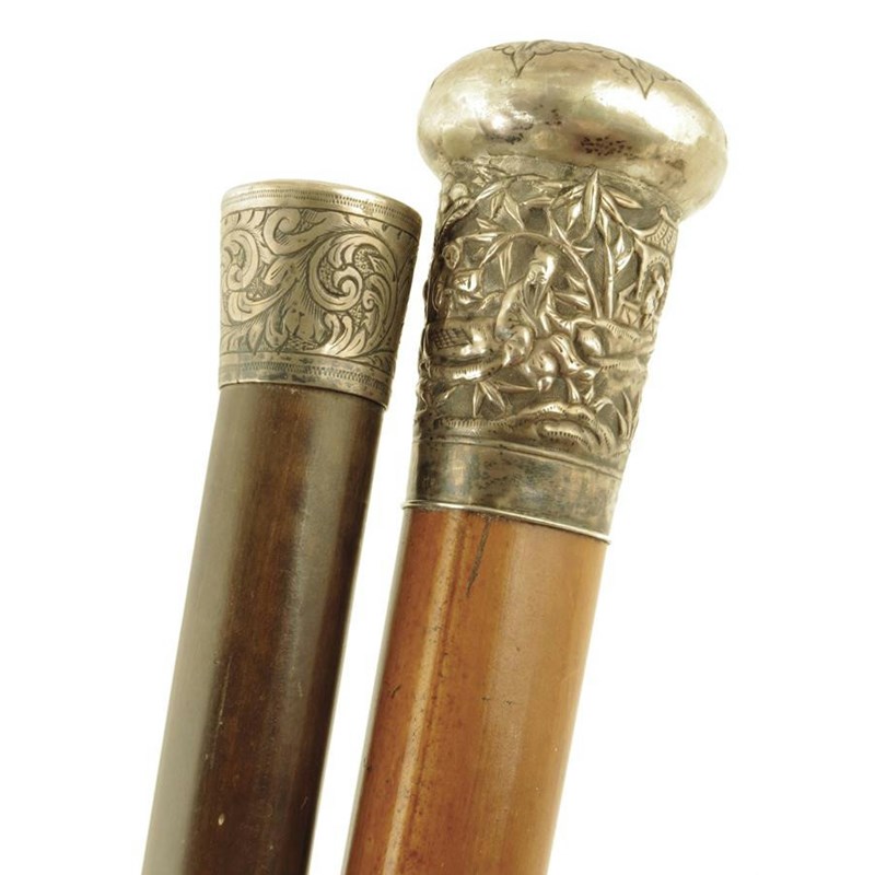 A late 19th century Chinese walking cane, the silver handle engraved with a monogram above figures in a landscape with buildings, with a malacca shaft, 89.7cm long, together with an ebonized walking cane, the engraved handle with initials. (2)