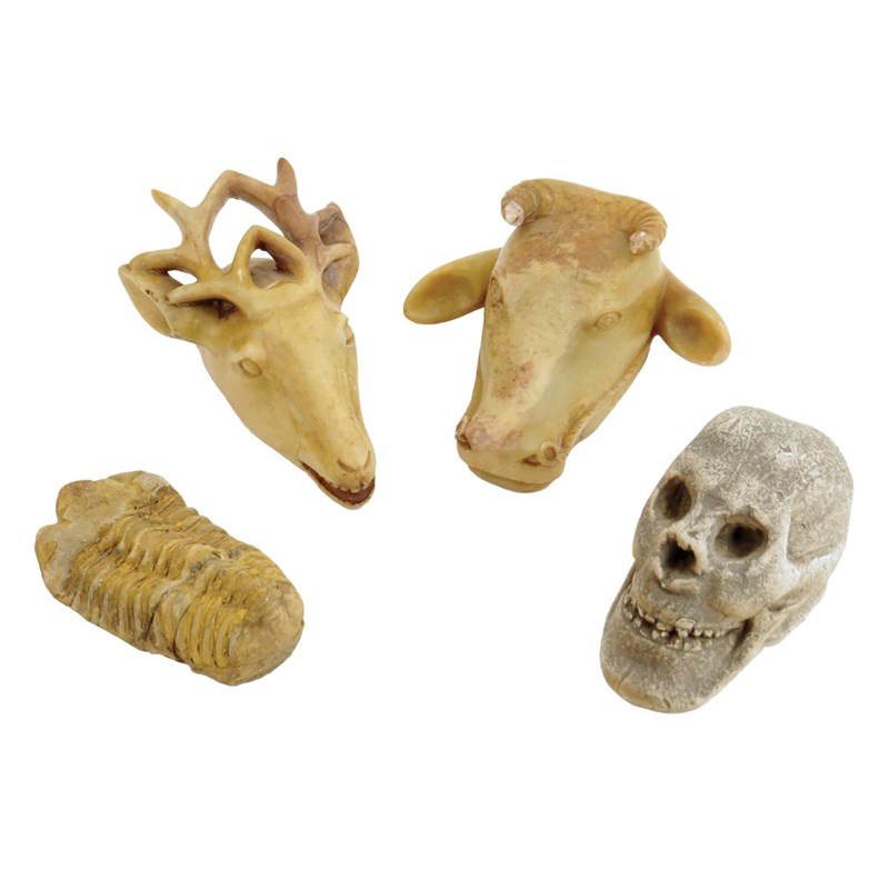 Two Chinese soapstone carvings, of a stag's head, signed and a buffalo head, a model of a human skull and a trilobite fossil 8cm, wide, max. (4)