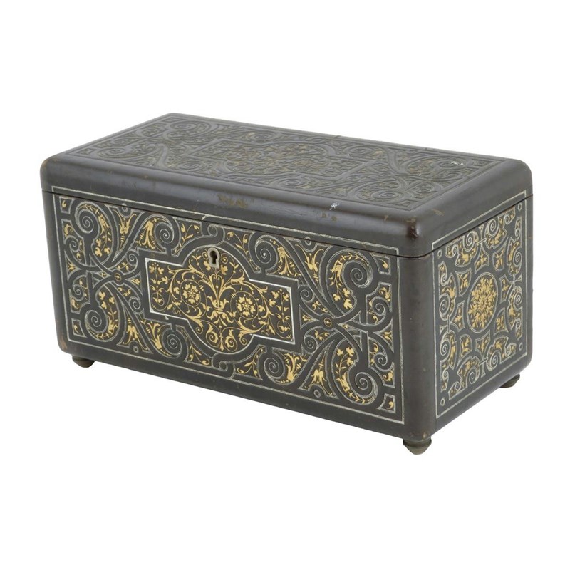 A late 19th century French leather box, with a gilt and silver tooled decoration of scrolling leaves, with a silk lined interior, 12.8cm high, 25.3cm wide, 12cm deep.