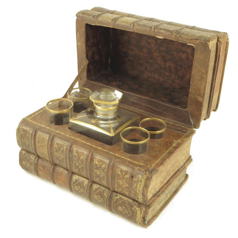 An early 20th century French leather bound book decanter box, the hinged lid revealing a gilt decorated decanter and four liqueur glasses, 12.2cm high, 17cm wide.