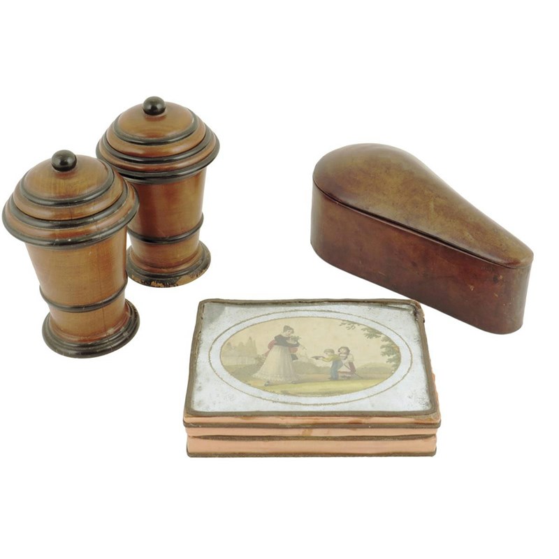 A French silk and metal thread lady's jewellery box, the hinged mirrored lid inset with a coloured stipple engraving, the interior also with a mirror, late 18th / early 19th century, 16.5cm wide, together with a leather covered box and cover, and a pair of beech and ebonized urns with lids. (4)