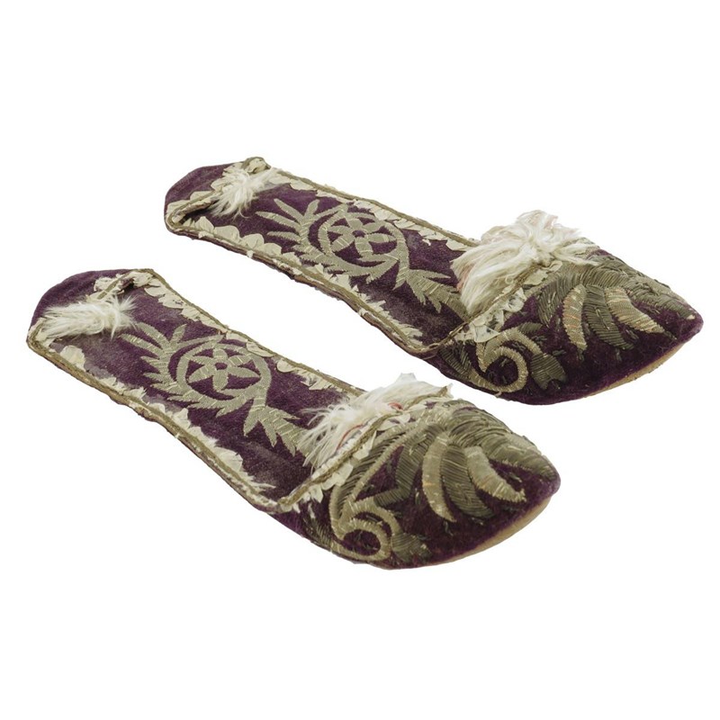 A pair of 18th century velvet and metal thread lady's slipper shoes