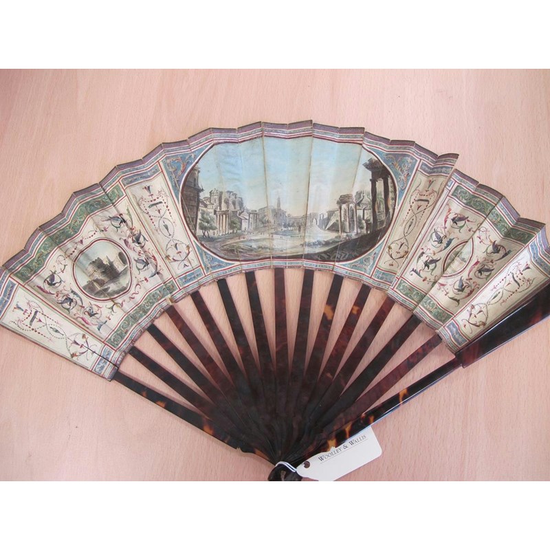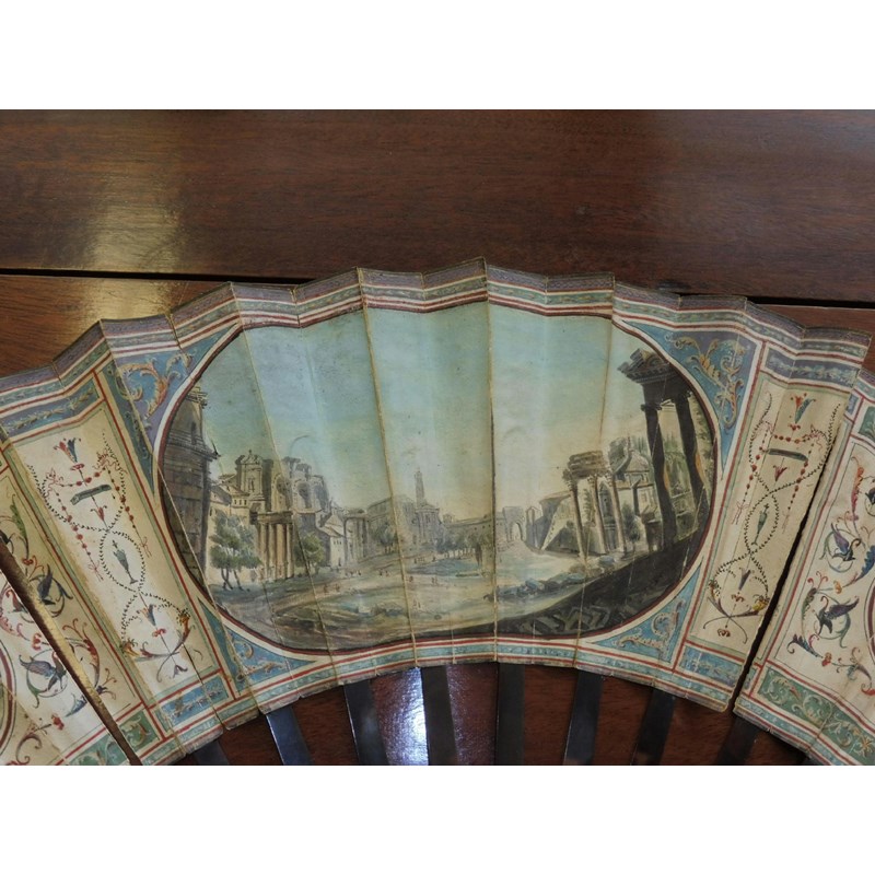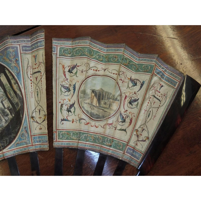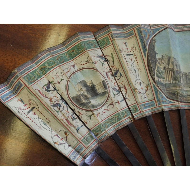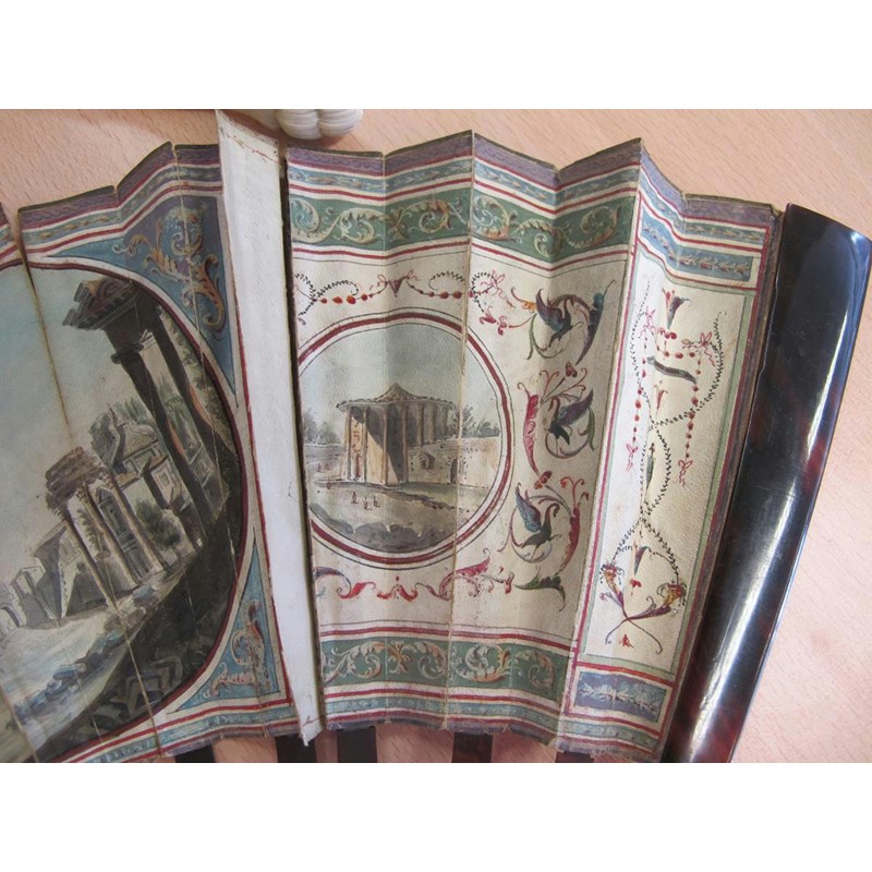 λAn 18th century Portuguese colonial hand painted fan, decorated with a pastoral scene of a shepherd and shepherdess shearing sheep and with other figures in a landscape setting with carved bone and mother of pearl guards, 29cm long, together with a 19th century Italian Grand Tour fan painted with grotesques and views of the Temple of Vesta, the Tomb of Caecilia Metella and of the Forum, with tortoiseshell sticks and guards, an ivory and lace fan and two cased fans, one in blonde tortoiseshell. (5)