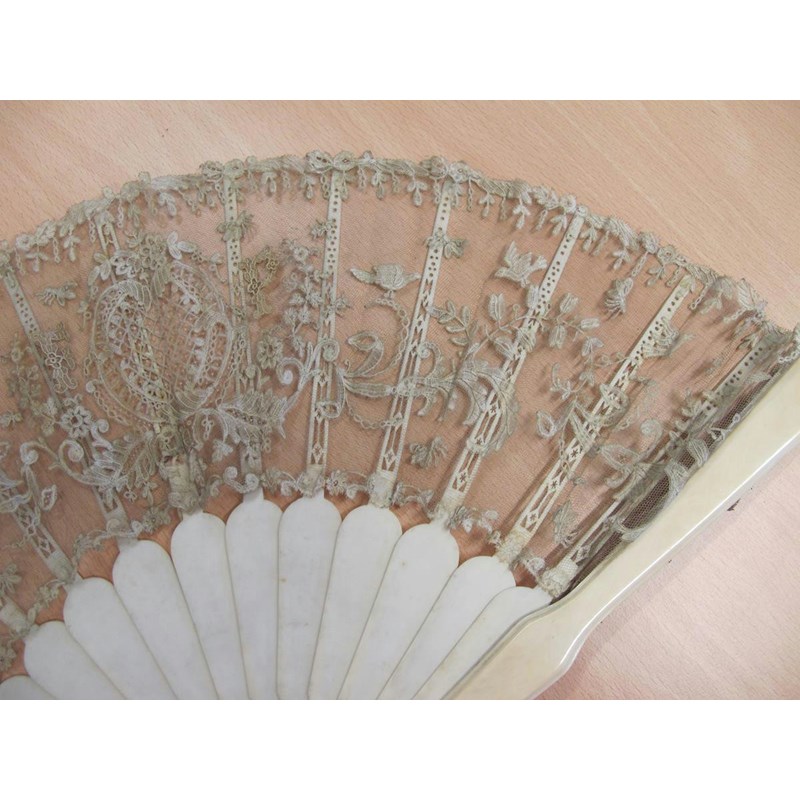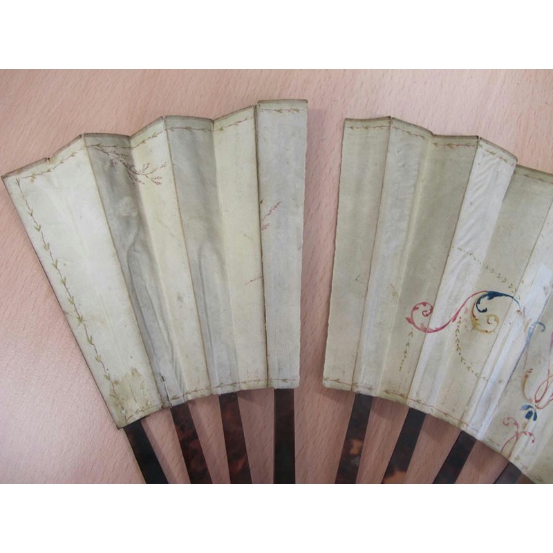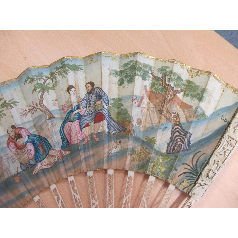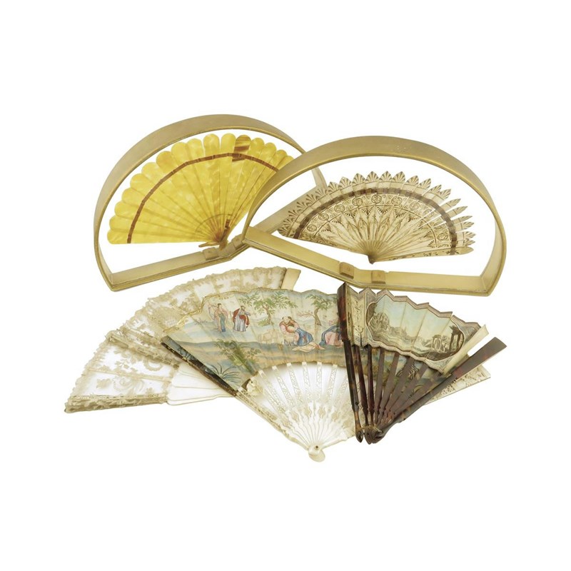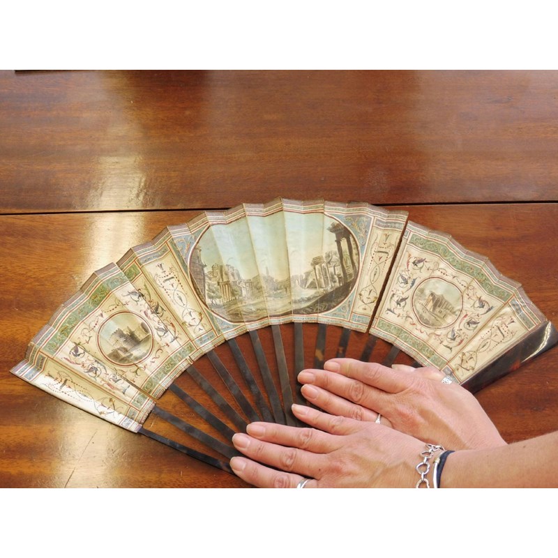 λAn 18th century Portuguese colonial hand painted fan, decorated with a pastoral scene of a shepherd and shepherdess shearing sheep and with other figures in a landscape setting with carved bone and mother of pearl guards, 29cm long, together with a 19th century Italian Grand Tour fan painted with grotesques and views of the Temple of Vesta, the Tomb of Caecilia Metella and of the Forum, with tortoiseshell sticks and guards, an ivory and lace fan and two cased fans, one in blonde tortoiseshell. (5)