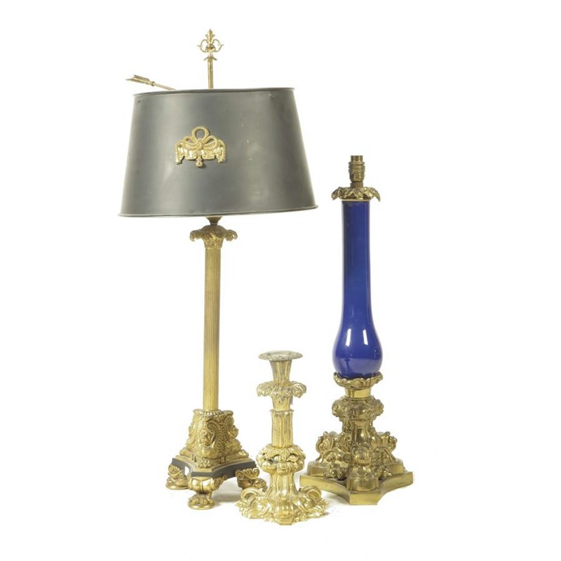 A Victorian gilt brass table lamp, with a blue opaque glass baluster stem, on a triform base, 63.4cm high, together with a gilt brass and black marble Empire style table lamp with a role shade and a William IV ormolu candlestick with a lappet decorated stem. (3)