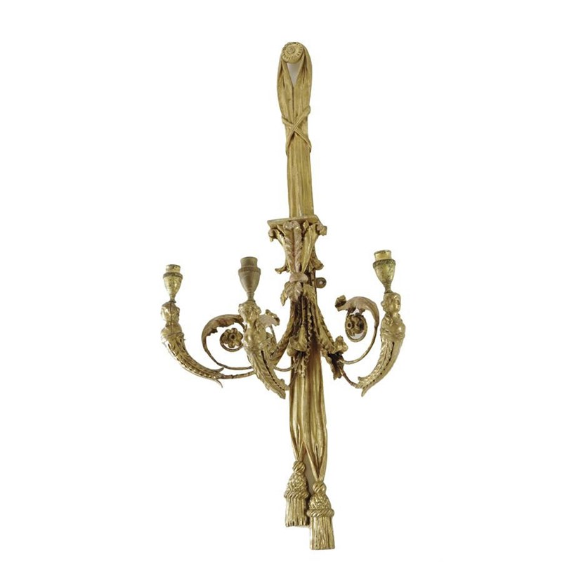 A George III giltwood wall light, the tasseled back plate to leaf decorated scroll arms terminating in female bust terminals supporting urn nozzles, 102.5cm high, 42.5cm wide.