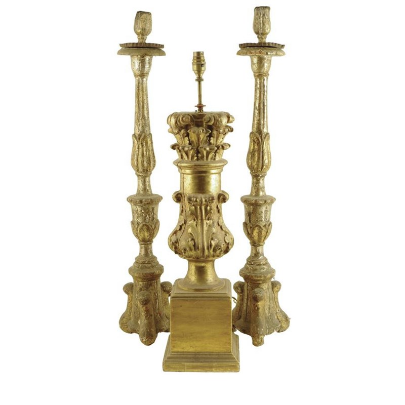 A pair of 18th century Italian silvered wood altar candlesticks, each with a fluted lappet carved stem and triform base, 82.2cm high, together with a 19th century Italian giltwood lamp base, 71.7cm high. (3)