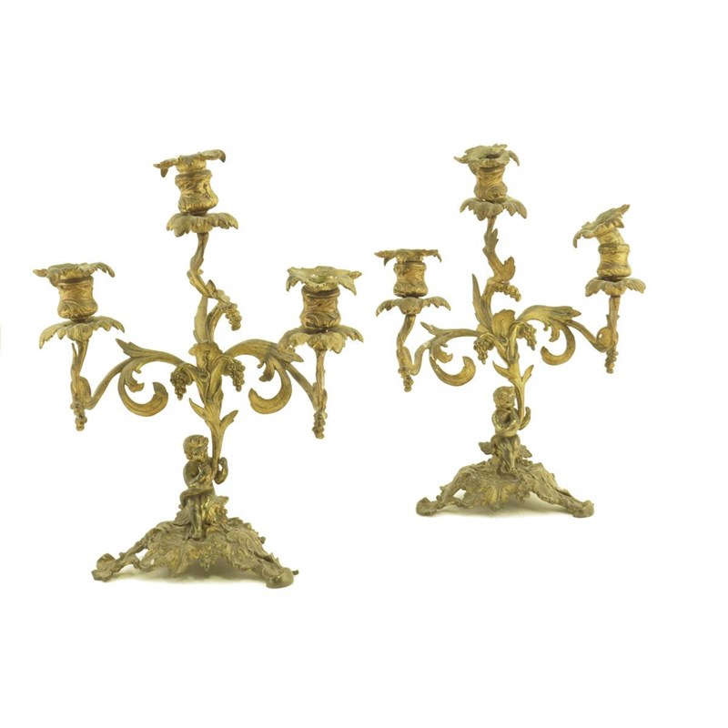 A pair of 19th century ormolu candelabra, with four leaf scroll branches issuing from a cornucopia held by a putto, on a vine leaf and grape base, 35.7cm high, 25.8cm wide. (2)