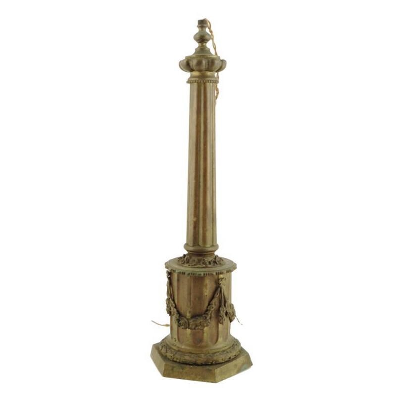 A 19th century bronze lamp base, in the form of a column, the fluted base hung with swags of flowers, 60.7cm high, 19cm wide.