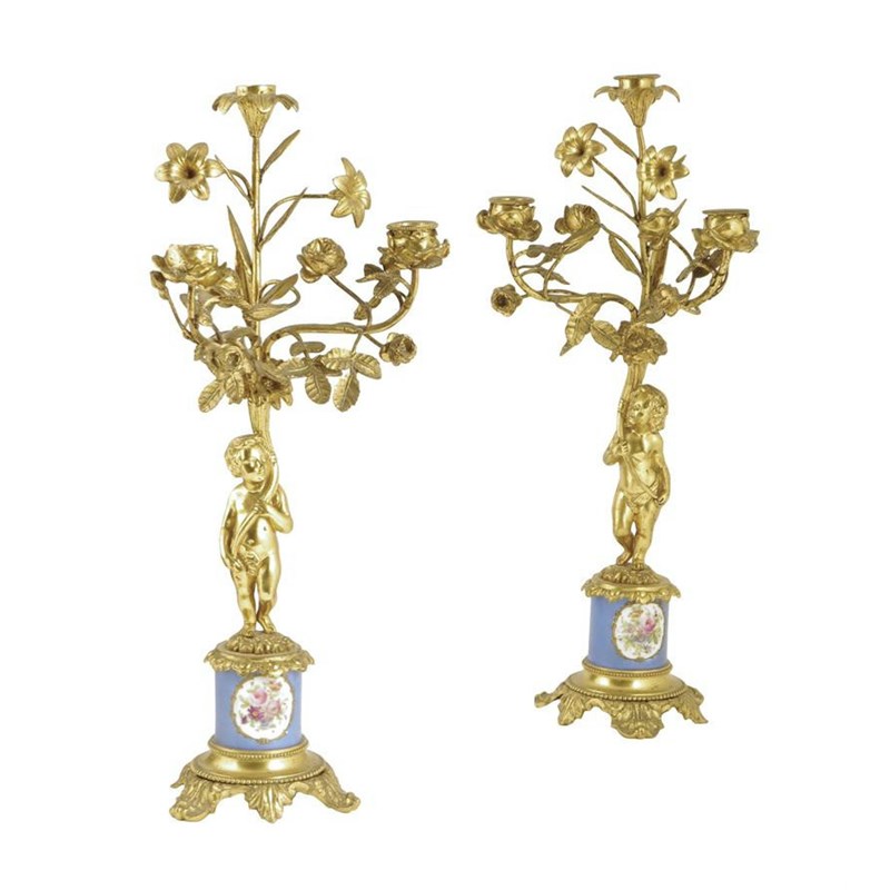 A pair of late 19th century French ormolu and porcelain four light candelabra