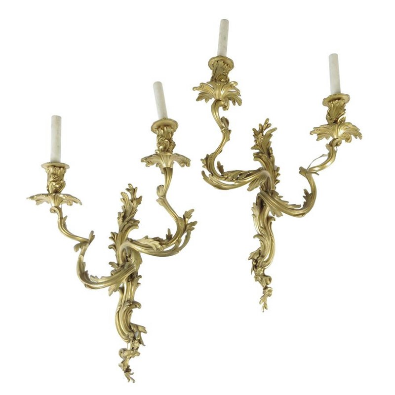 A pair of Louis XV style ormolu twin light wall appliques