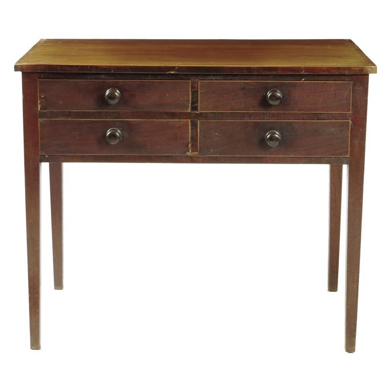 A George IV mahogany side table, inlaid with boxwood stringing, the crossbanded top above four short drawers, 72.6cm high, 84.5cm wide, 47.2cm deep.