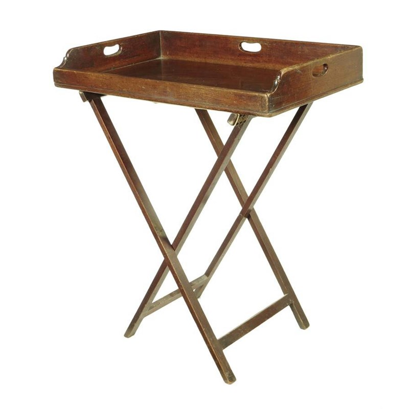 An early 19th century mahogany butler's tray, pierced with three handgrips, on a folding stand, 97.7cm high, 81.5cm wide, 52cm deep.