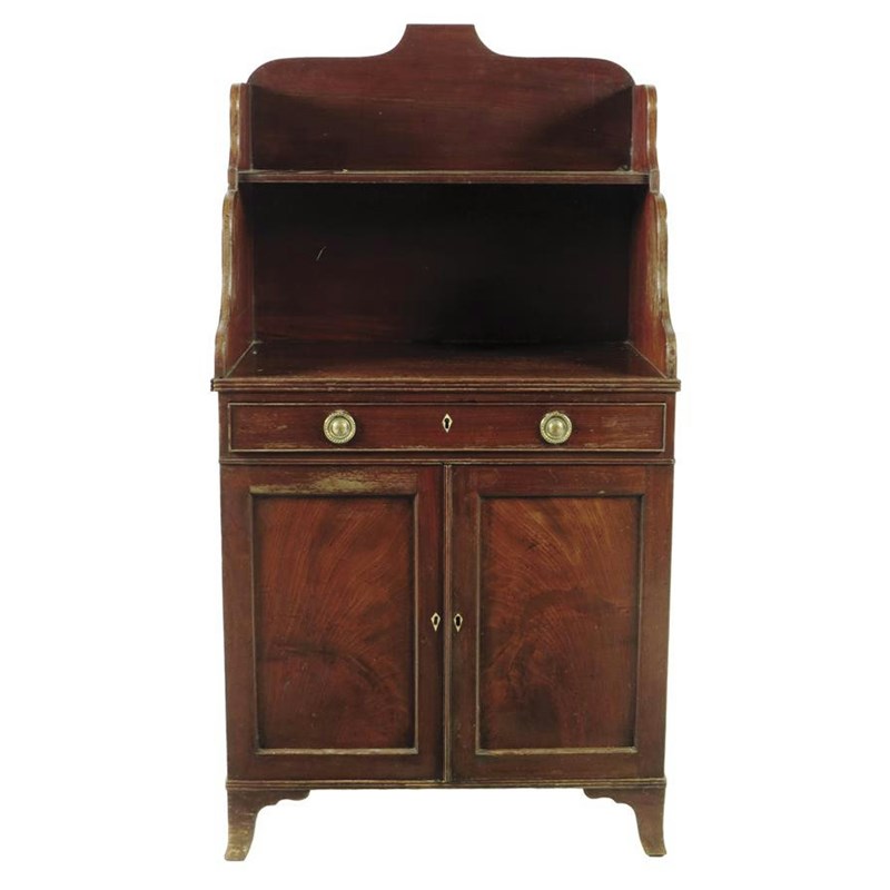 A Regency mahogany side cabinet, with a frieze drawer above a pair of panelled doors enclosing an adjustable shelf, 137cm high, 72.7cm wide, 46cm deep.