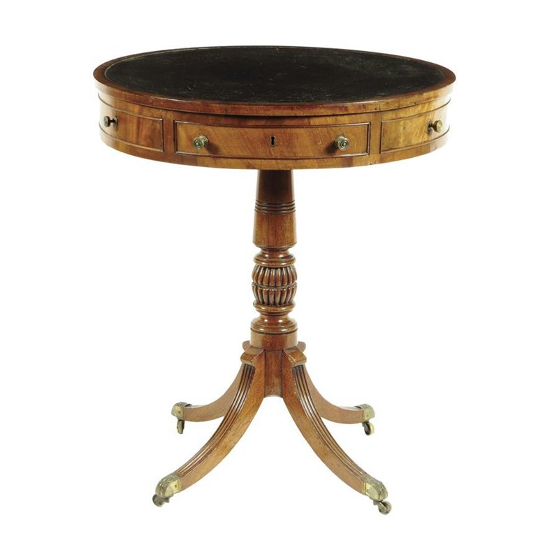 A George IV mahogany drum table, the circular top inset with tooled black leather, above two cedar lined frieze drawers, and two false fronts, the turned stem on reeded supports terminating in foliate brass sabots and castors, 76.3cm high, 65cm diameter.
