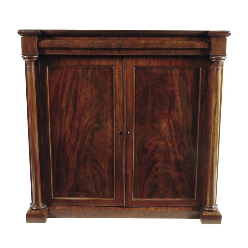 An early Victorian mahogany inverted breakfront collector's cabinet, with a pair of frieze drawers, above a pair of turned columns flanking panelled doors enclosing twenty short drawers, 113.2cm high, 116.8cm wide, 54.3cm deep.