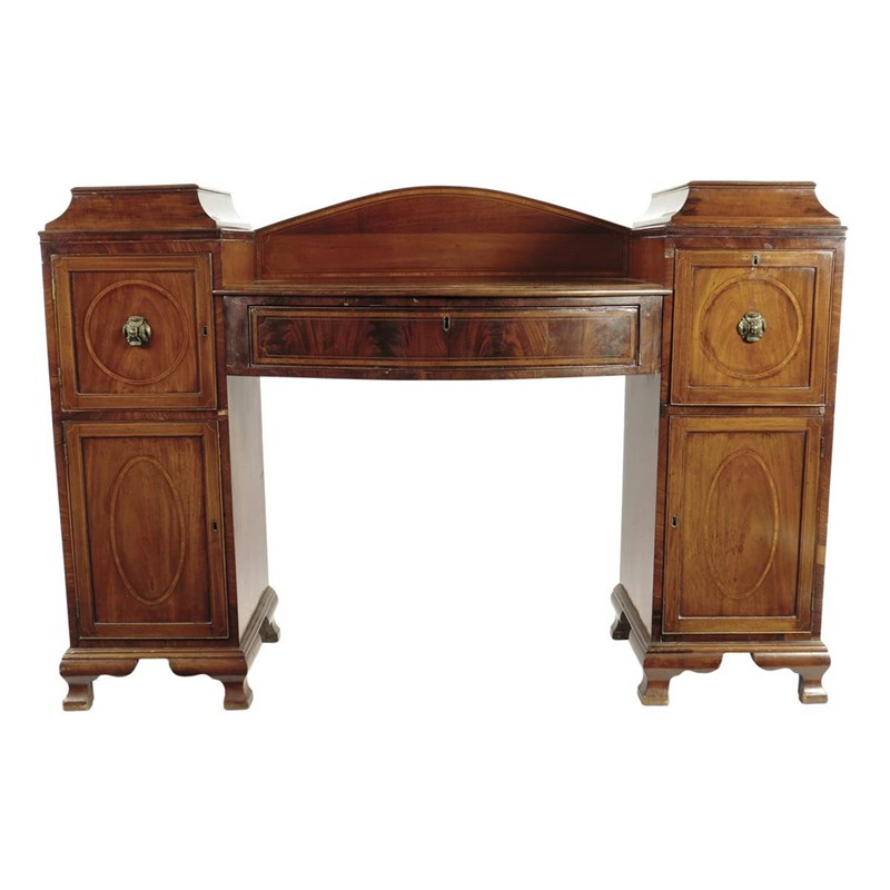 A William IV mahogany twin pedestal sideboard, inlaid boxwood stringing and kingwood crossbanding, each pedestal with a hinged top revealing baize lined cutlery divisions with a cellaret drawer to the right side and a cupboard to the left, each with a foliate brass handles above cupboards and with a central bowfront drawer, 113.9cm high, 170.4cm wide, 57.3cm deep.