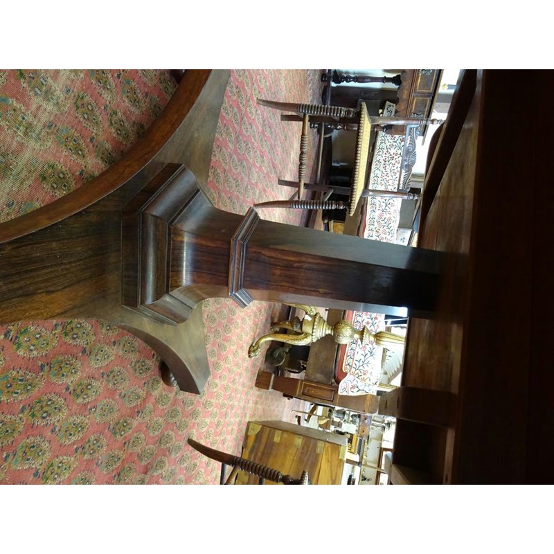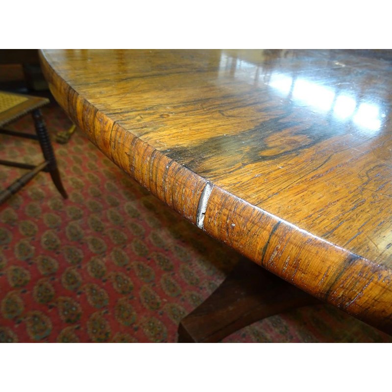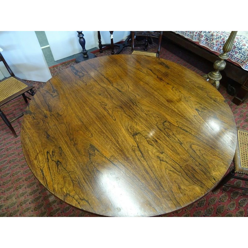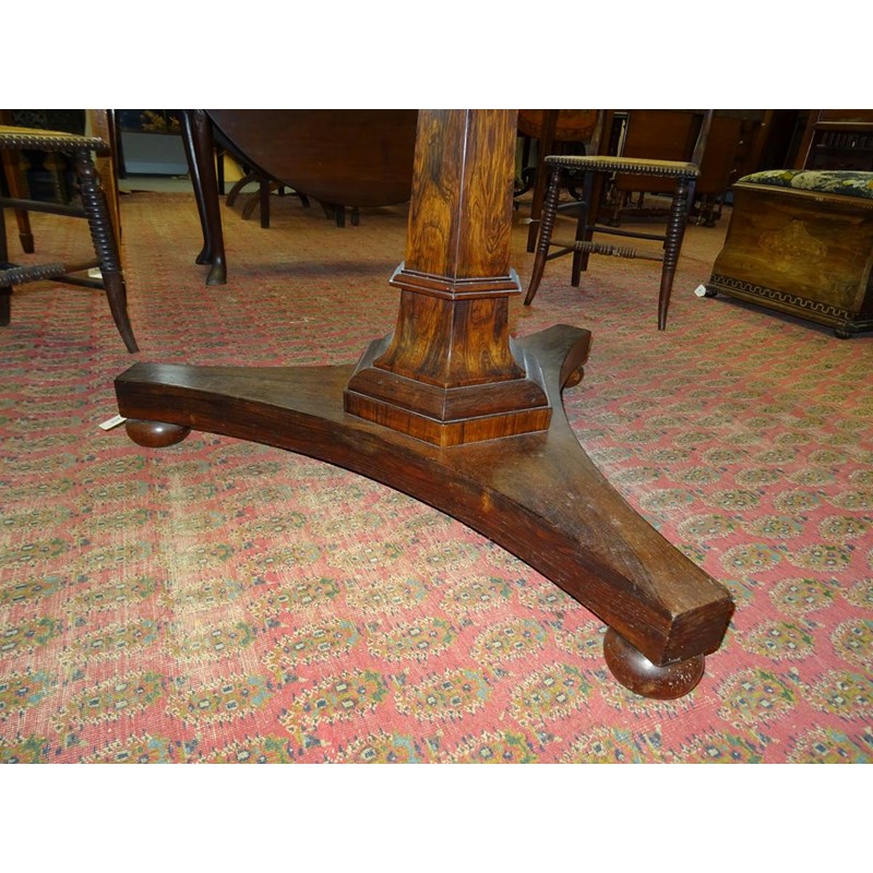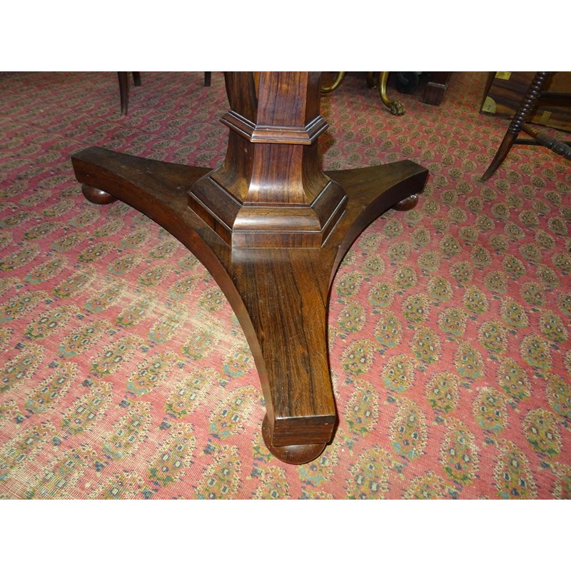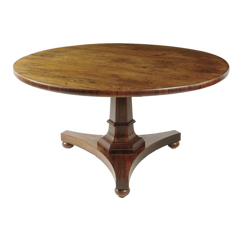 λA William IV rosewood breakfast table by Gillows, the circular tilt-top on a faceted stem and a triform base, on sunken brass castors, 71.8cm high, 137cm diameter.