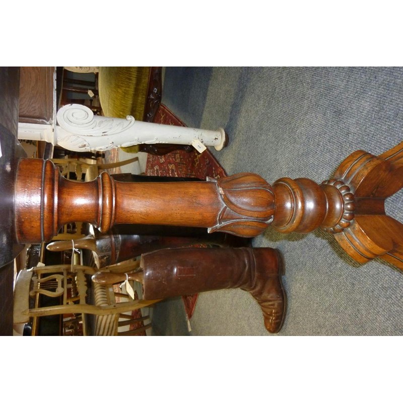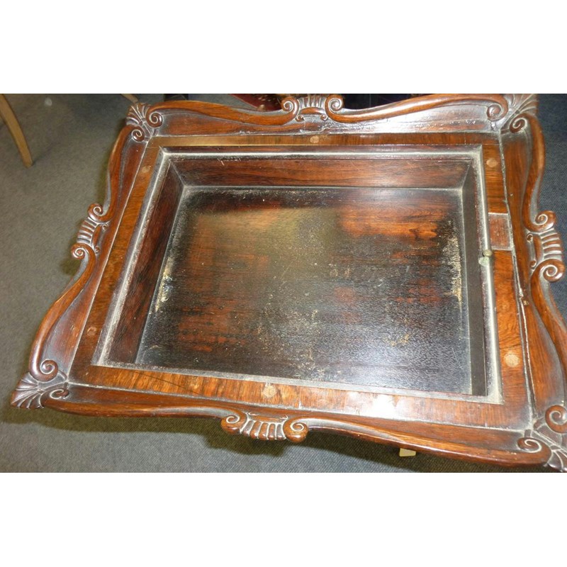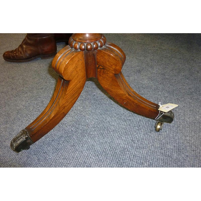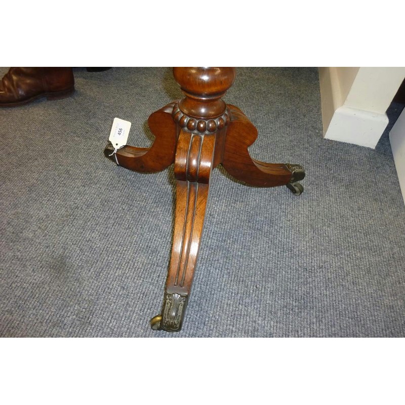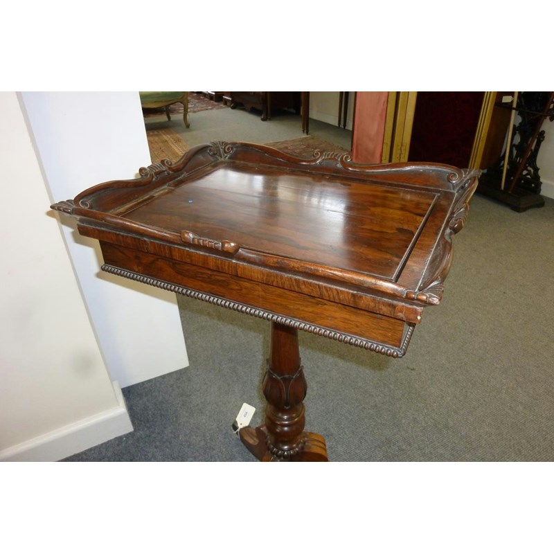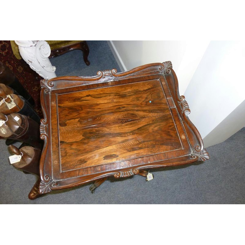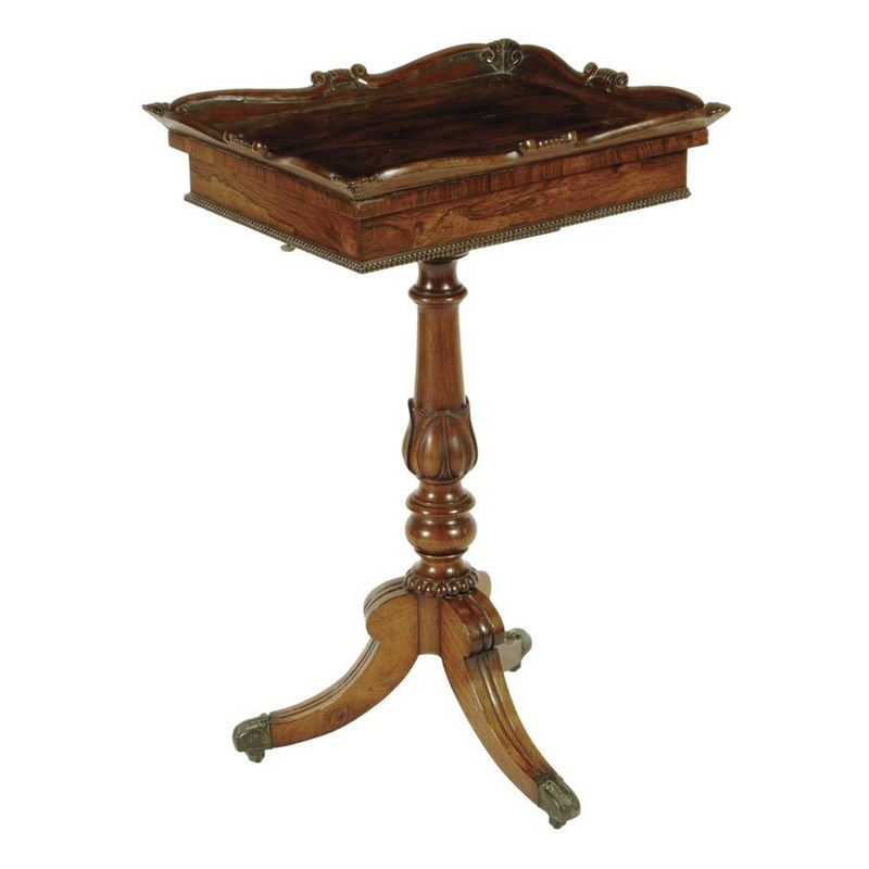 λA George IV rosewood jardinière table in the manner of Gillows, the scroll and palmette carved gallery above a lift-off cover revealing a liner on a lappet carved stem and moulded supports terminating in brass foliate sabots and castors, 77.8cm high, 49cm wide, 39cm deep.