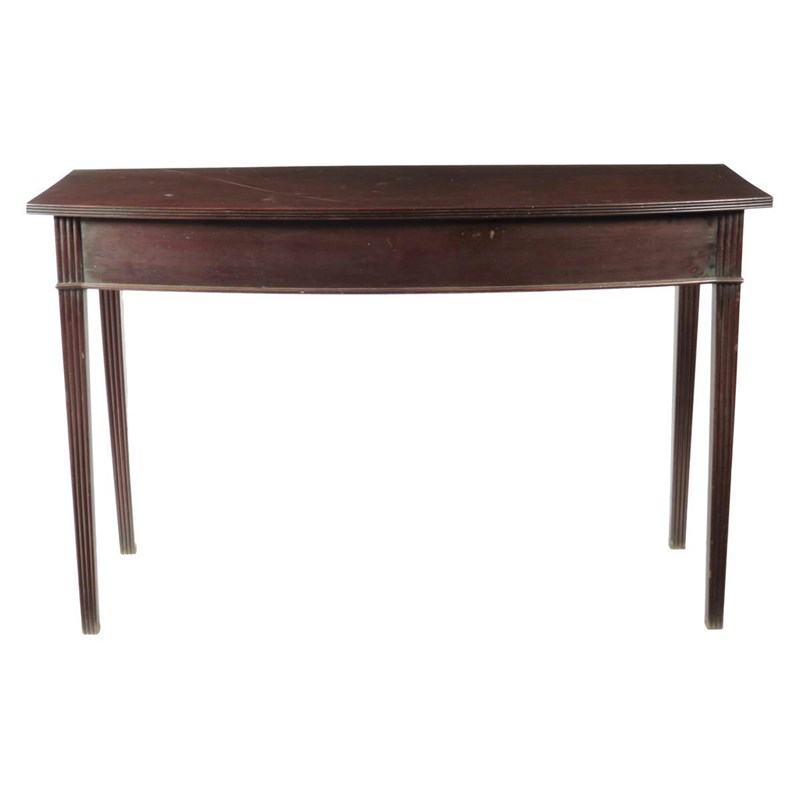 A Regency mahogany bowfront serving table, with a reeded edge top on ribbed tapering legs, 83.1cm high, 132.4cm wide, 49.6cm deep.