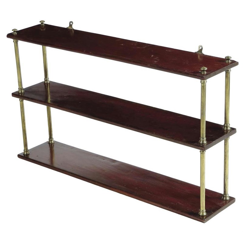 A set of 19th century mahogany Campaign wall shelves, with detachable turned brass supports, 52cm high, 88.9cm wide, 18.8cm deep.
