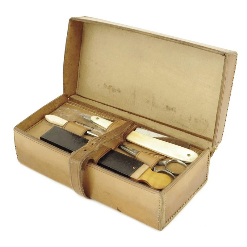 A brown leather cased Campaign toilet set, fitted with a hone, steel scissors, a button hook, a razor, a shaving brush in a bone case, and two other brushes and with a metal soap container, the lid with initials 'J.H.B.', 21cm wide.