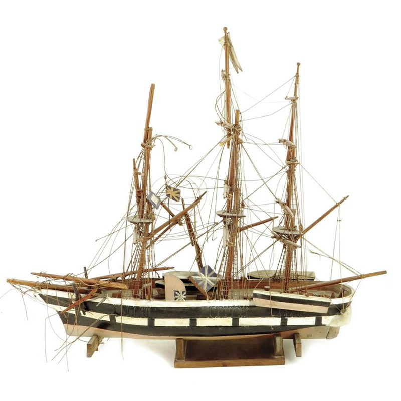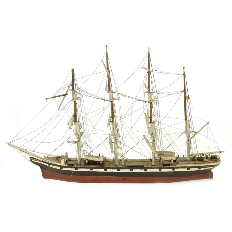 A carved and painted wood model of 'Mary Ann', a three masted sailing ship, 43.3cm high, together with a similar model of a four masted ship. (2)